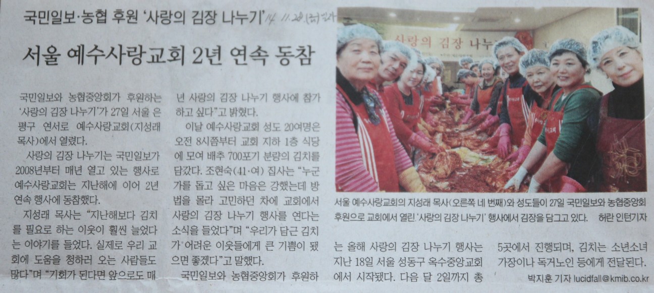 2014. 사랑의 김장나누기 본문 2014. 사랑의 김장나누기2014. 사랑의 김장나누기2014. 사랑의 김장나누기2014. 사랑의 김장나누기 국민일보와 농협이 후원하는 사랑의 김장나누기를 소외되고 어려운 이웃들과 나누었습니다. 이 모든 것을 가능케 하신 하나님께 감사와 영광을 올려 드립니다. 일시 : 2014년 11월 27일(목) 관리자 조회 6,829회 2014-12-20 10:24 목록 댓글목록 이전글 2014. 추수감사예배 14.12.20 다음글 교회 간판 사진 14.12.20